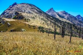 鹿角梁南坡皆为悬崖深谷,纵览群山险峻壮观。山高云闲风劲。北面草甸广阔,花草丰茂。沿山梁渐次登高。走过莽莽数个草垫,穿行于参天林木。每到一个制高点极目远眺,冰晶顶,光头山尽收眼底。南北群峰更是炙手可得,感受激情澎湃豪情万丈。大斜坡的草甸如牧场舒展,青松冷杉错落排列,坚木如磐枯而不倒,芳草芍药红绿相间。逶迤天边的峰峦中绝壁万仞,幽谷千尺,怪石嶙峋,若能遇上多云或者阴天微雨的天气,更是雾峰云岭漫芳荫,紫岱青峦羞烟阵。妙不可言,美不胜收。