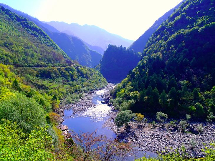 从马召沿108国道进山,入山处里程碑为1385,1435处即到黑河。刚进山时有几个大上大下的陡坡,约莫十几公里,上到坡顶可以看到黑河水库的景色还是很赞的。快到陈河时路面下到和河面几乎相同高度后,开始沿河而上的一路缓坡。入山后的50公里还是很考验体能的,而且时常看到有山上掉下来的石头躺在路中间,心里难免有点发毛。